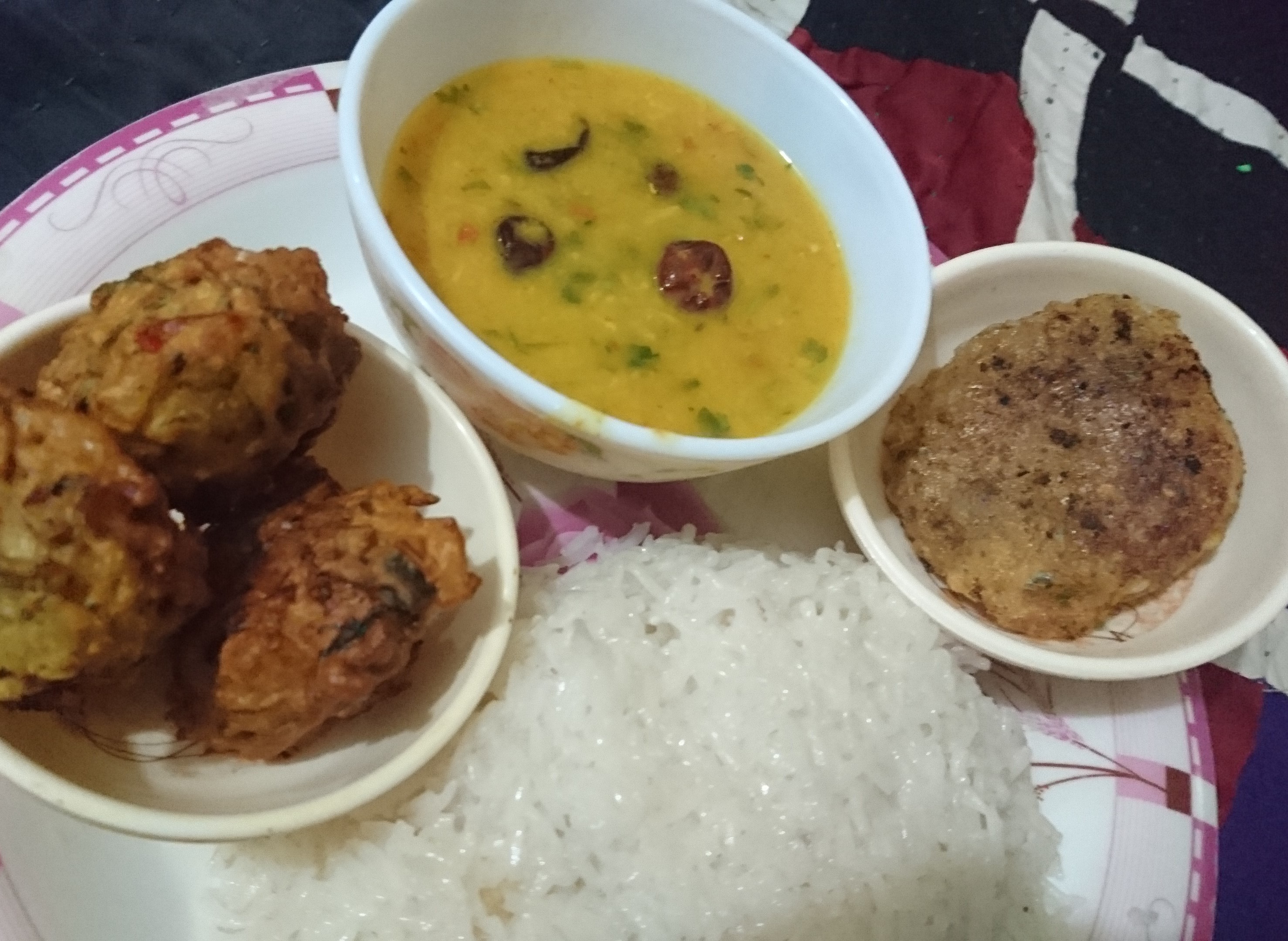 Mung masoor eat with rice, onion pakora, and Aloo kabab.